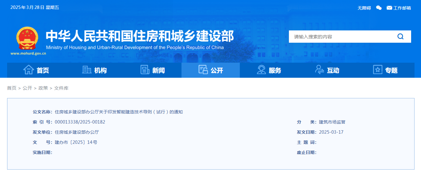 為貫徹落實《中共中央辦公廳、國務院辦公廳關(guān)于推進新型城市基礎(chǔ)設施建設打造韌性城市的意見》等文件要求,加快推進智能建造技術(shù)在工程建設全生命期應用,推動建筑業(yè)高質(zhì)量發(fā)展,住房城鄉(xiāng)建設部組織編制了《智能建造技術(shù)導則(試行)》?,F(xiàn)印發(fā)給你們,請結(jié)合實際參照執(zhí)行。